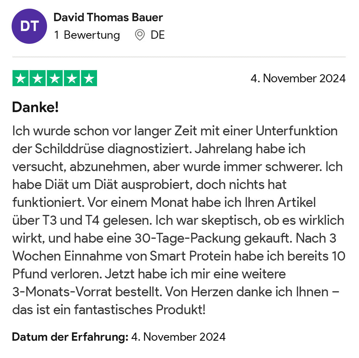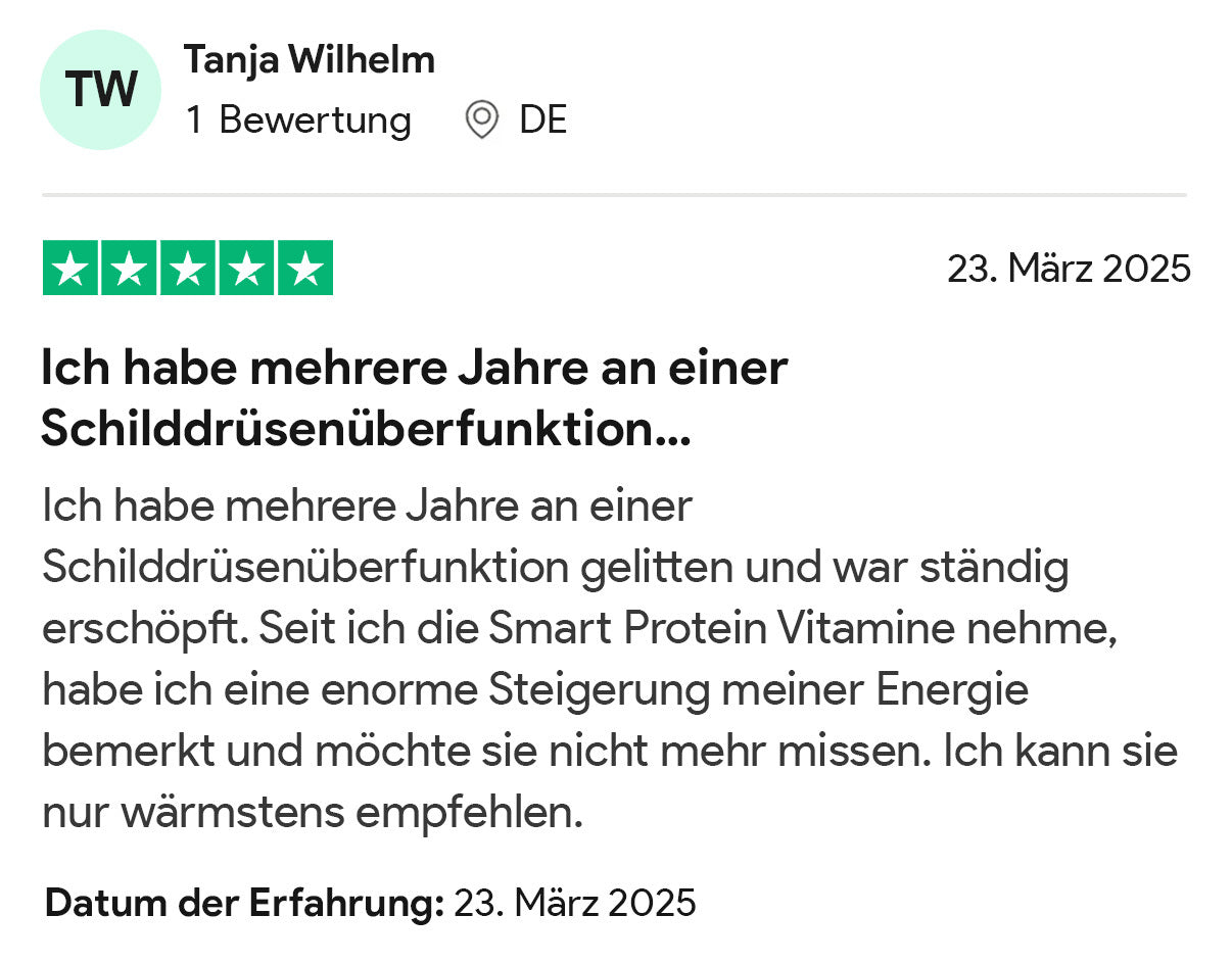 Ich bin froh, dass ich auf Smart Protein gestoßen bin und kann es jedem mit einer Schilddrüsenunterfunktion wärmstens empfehlen.