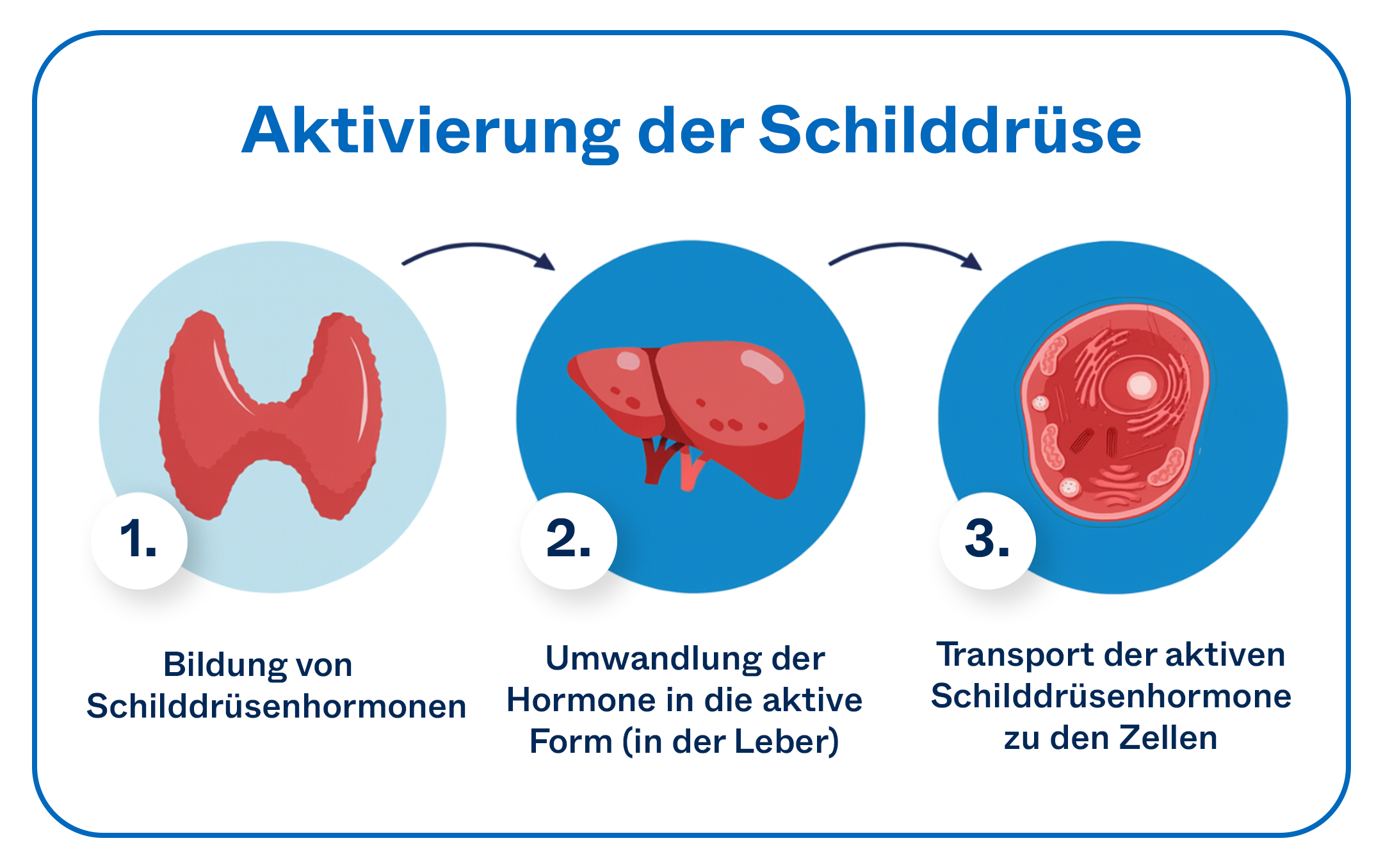 Denn: Die Schilddrüsenhormone müssen zuerst in ihre aktive Form umgewandelt und dann in die Zellen transportiert werden.